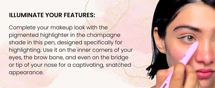 Complete your makeup look with the champagne highlighter in this pen — designed to make your features pop! Apply it to the inner corners of your eyes, brow bone, and nose bridge for a radiant, snatched glow that turns heads. 🌟